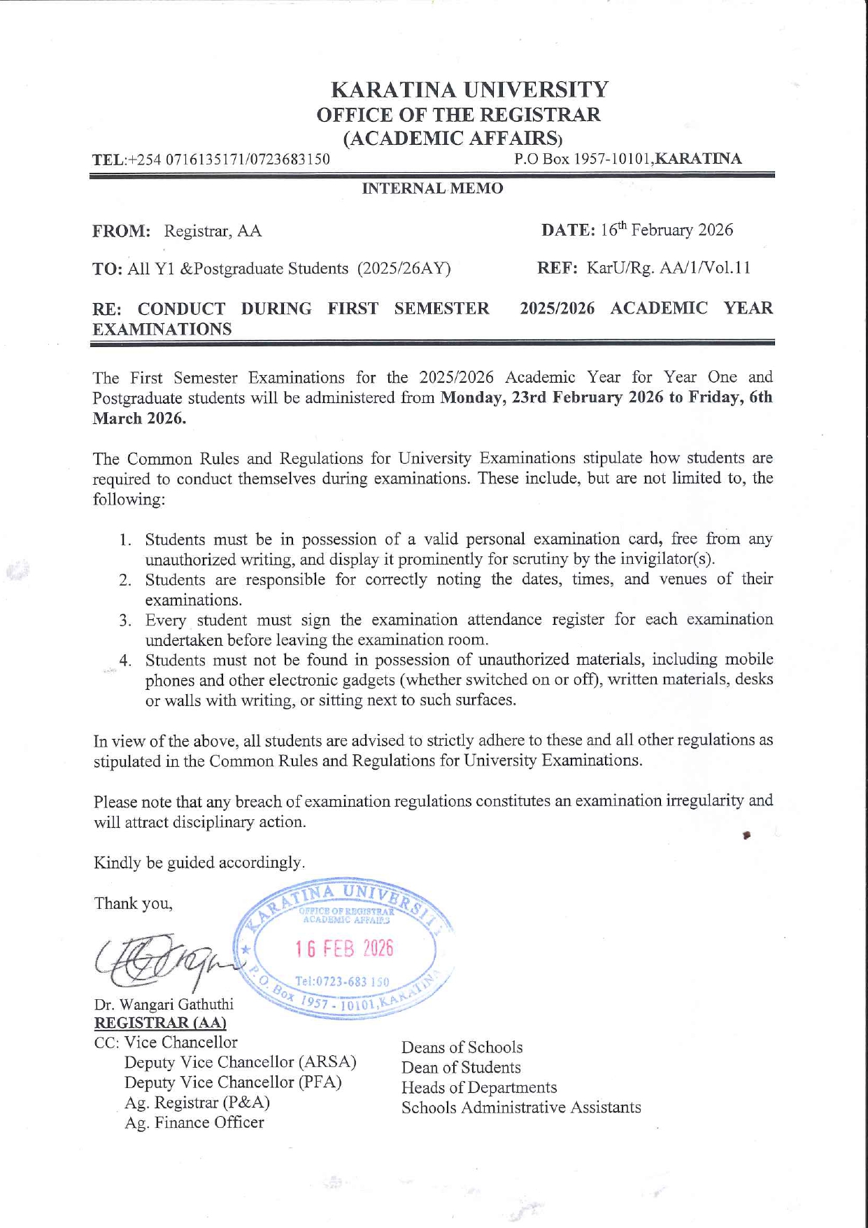 CONDUCT DURING FIRST SEMESTER EXAMINATIONS 2025/2026 ACADEMIC YEAR