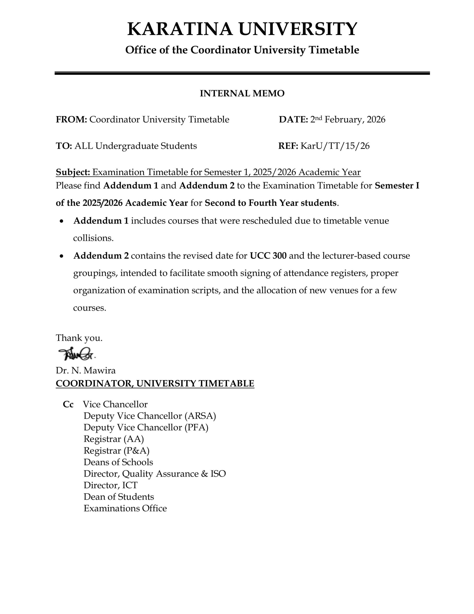 EXAMINATION TIMETABLE FOR SEMESTER 1, 2025/2026 ACADEMIC YEAR(ADDENDUM 1 AND ADDENDUM 2)