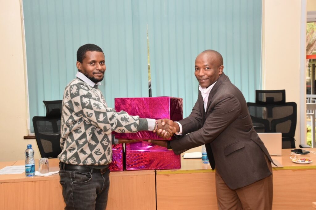 One of the interns receives a gift from Mr. Richard Ruhiu the Acting Registrar P&A