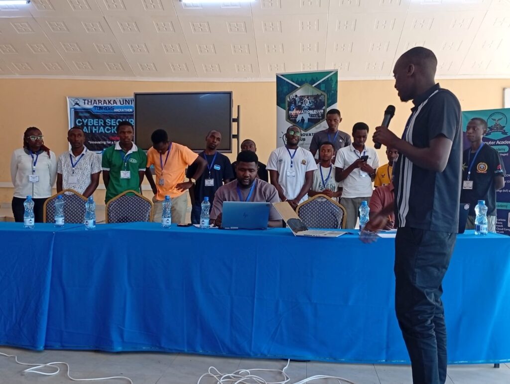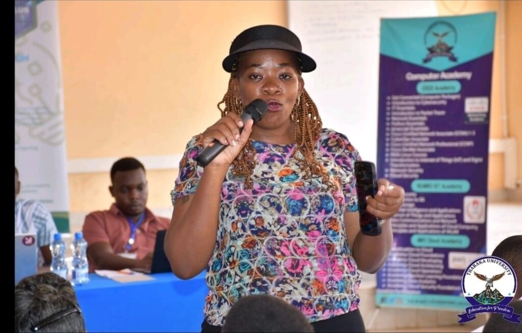 The Director ODEL and Team lead addressing the audience during the hackathon competitions at Tharaka University.