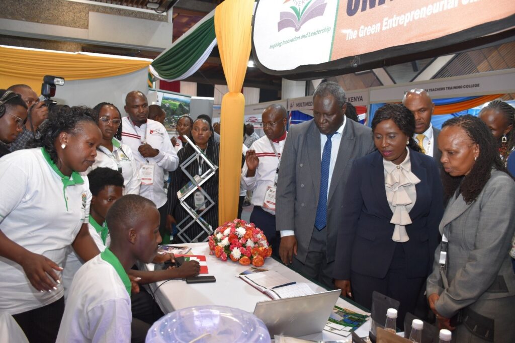 Our student innovators showcase their projects to the DVC ARSA Prof.Franklin Wabwoba, Dr. Beatrice Inyangala PS for Higher Education, and Dr. Agnes Wahome CEO of KUCCPS during a tour of the university booth.