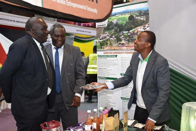 During the exhibition, Prof. Franklin Wabwoba, Deputy Vice-Chancellor (Academic, Research and Student Affairs), on behalf of Karatina University, welcomed the Principal Secretary to the University’s booth. The University’s student innovators, led by Victor Githae, showcased their projects, including an app designed to provide mental support to peers. The Principal Secretary commended the innovative student-led initiatives and products developed by the Tea Institute.
