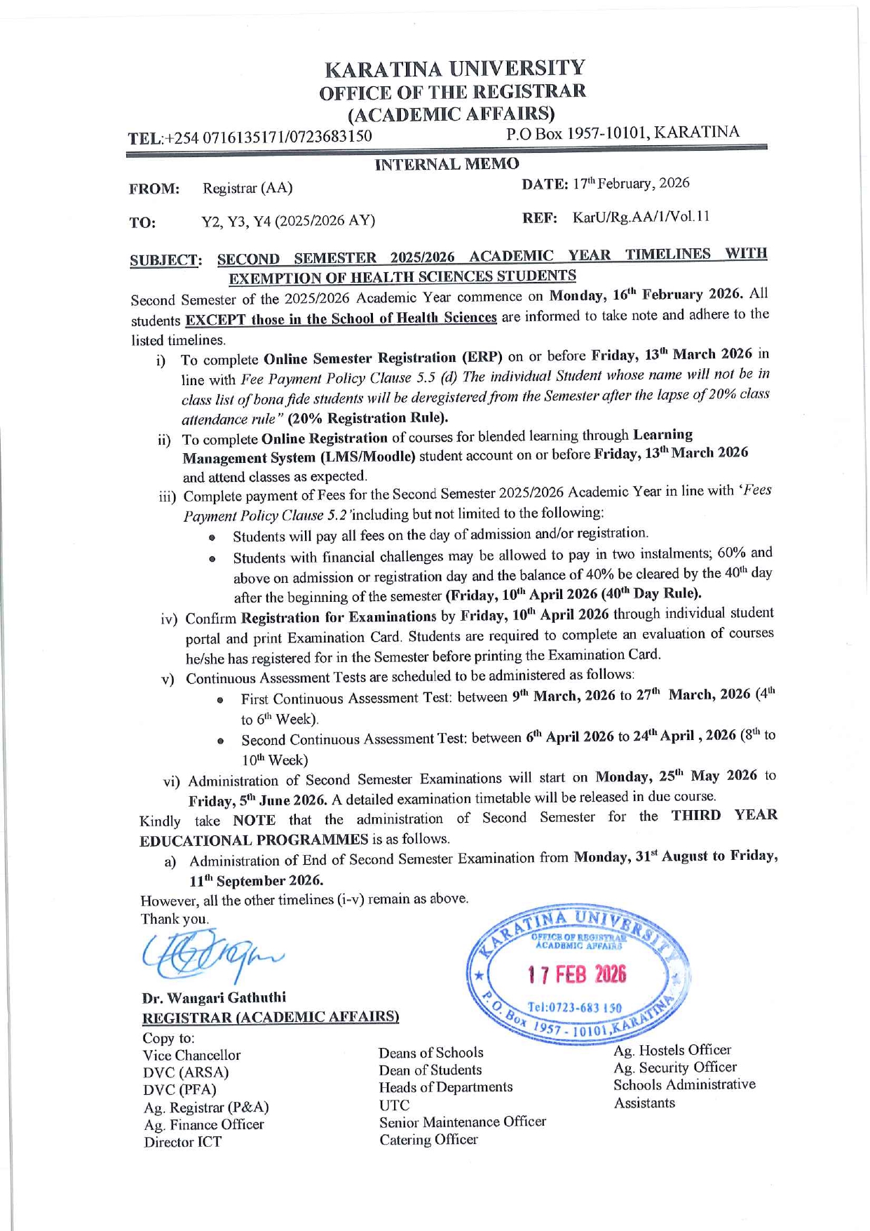 SECOND SEMESTER 2025/2026 ACADEMIC YEAR TIMELINES WITH EXEMPTION OF HEALTH SCIENCES STUDENTS