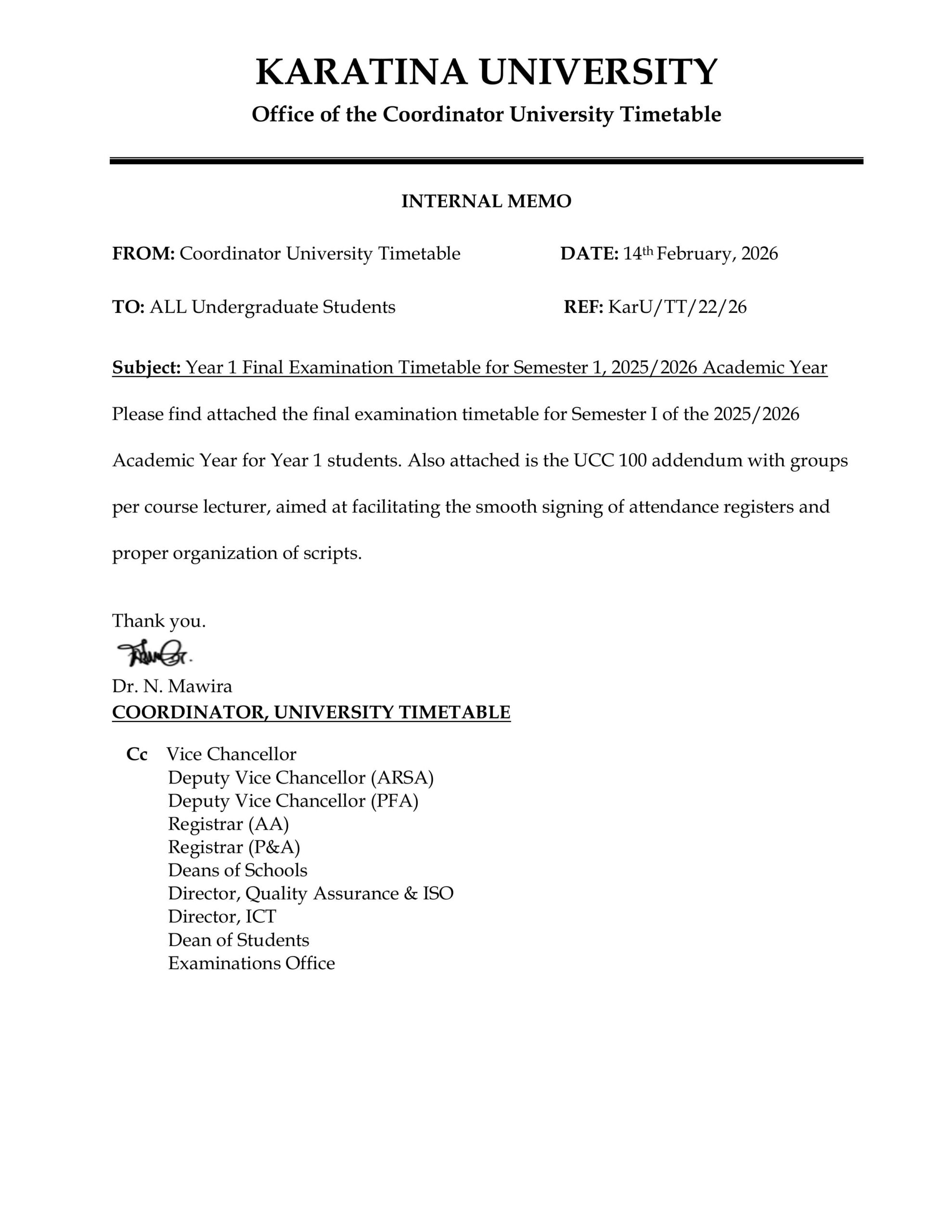 YEAR 1 FINAL EXAMINATION TIMETABLE FOR SEMESTER 1, 2025/2026 ACADEMIC YEAR